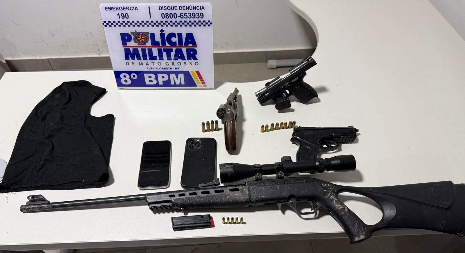 Durante a ação policial, também foram apreendidos armamentos e outros materiais, entre eles uma pistola calibre .380, um revólver calibre .38, uma carabina calibre .22 e um simulacro de arma de fogo.